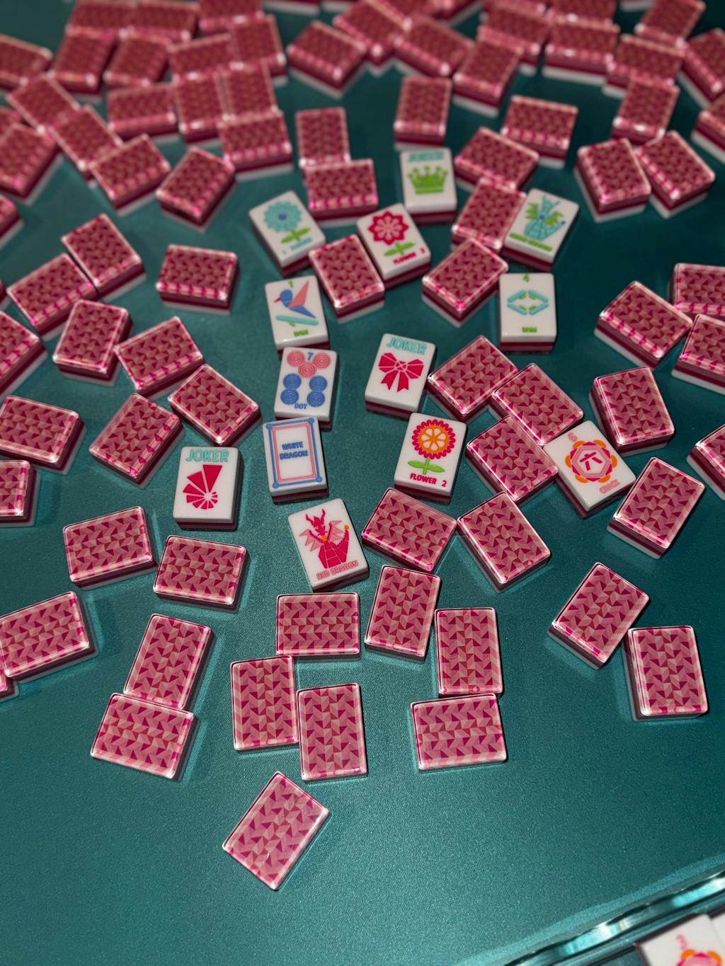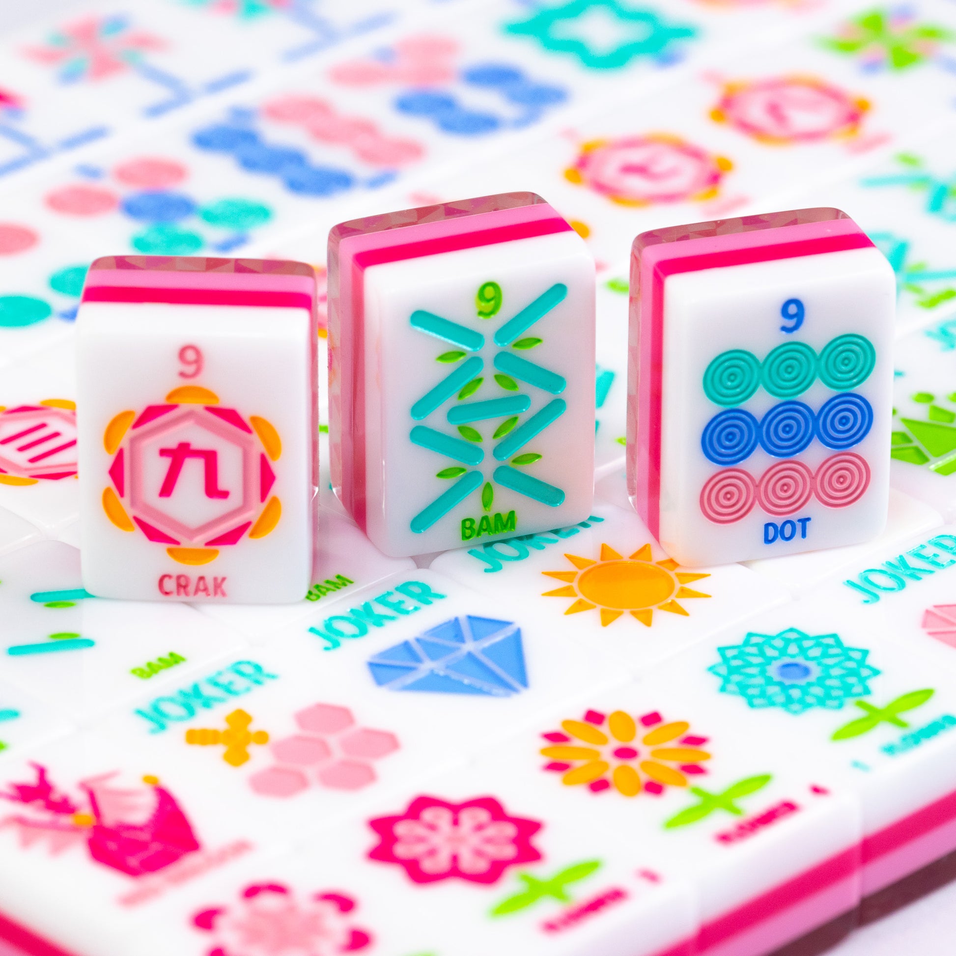 Introducing the Prism Series Tile Set in Prism-Pink. Mahjong with Bold Angles and Vibrant Vibes. This set is part of the Crystal Collection and features labeled tiles for ease of play, making it an incredible set to teach with and excellent for players wanting a touch of whimsy, but who appreciate clear tile identification! This set is delightfully chunky and includes designs that are geometric in nature, with all the right angles and a unique look and feel.
