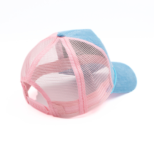 Two-Tone Design - Corduroy front and bill in your colorway of choice (Pink, Blue, Green), paired with contrasting mesh in the back.